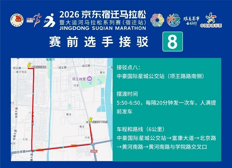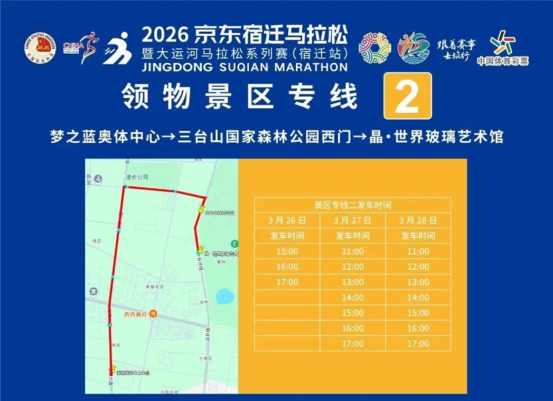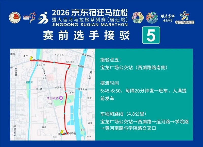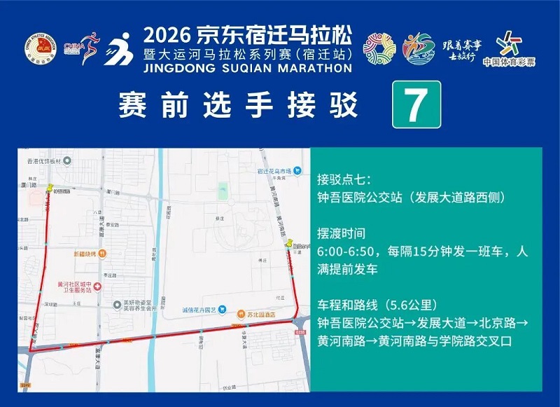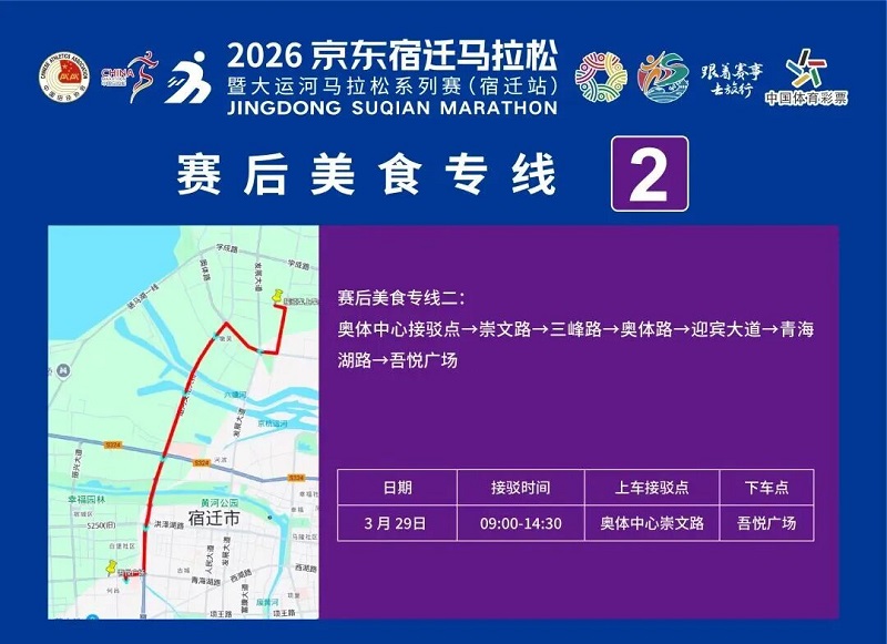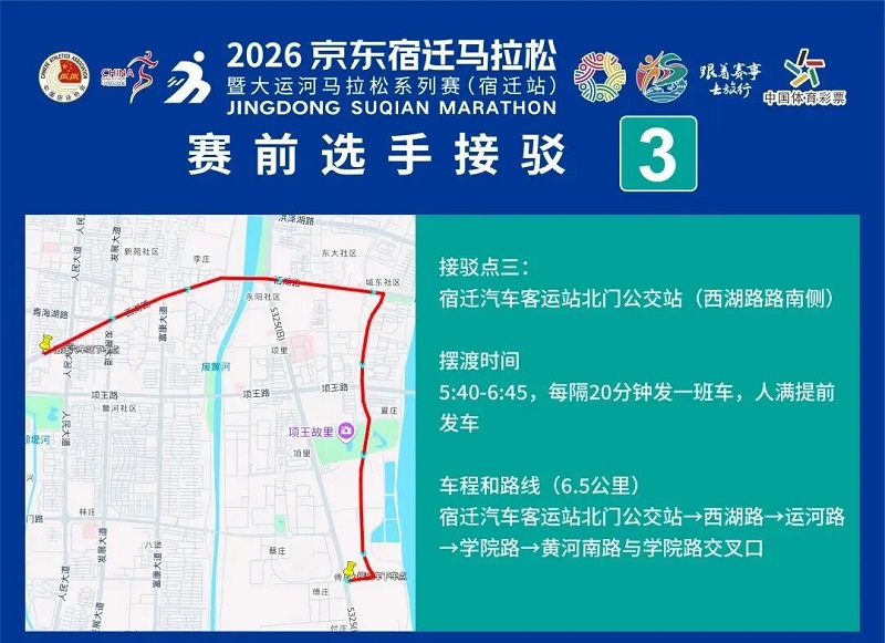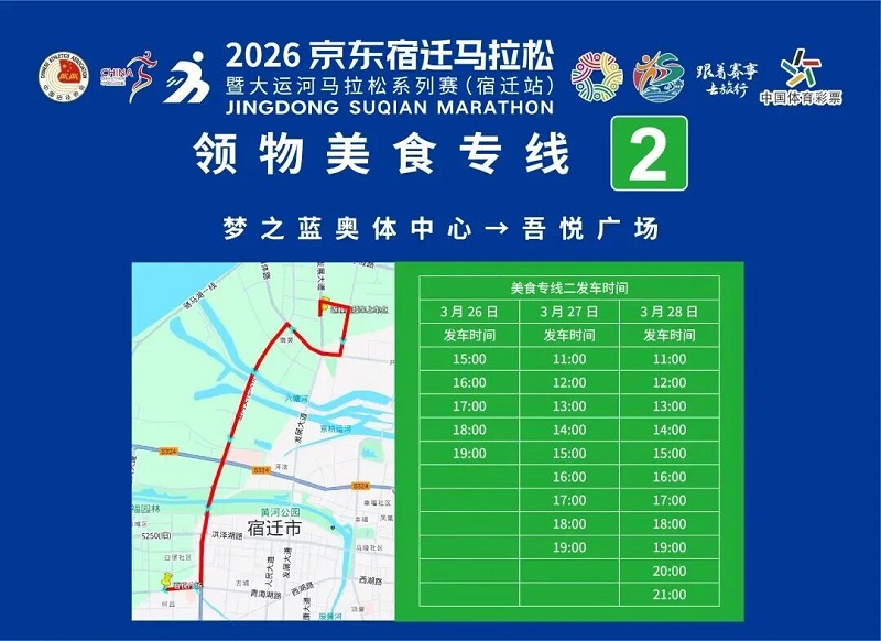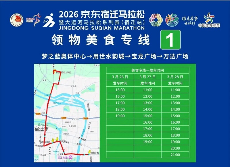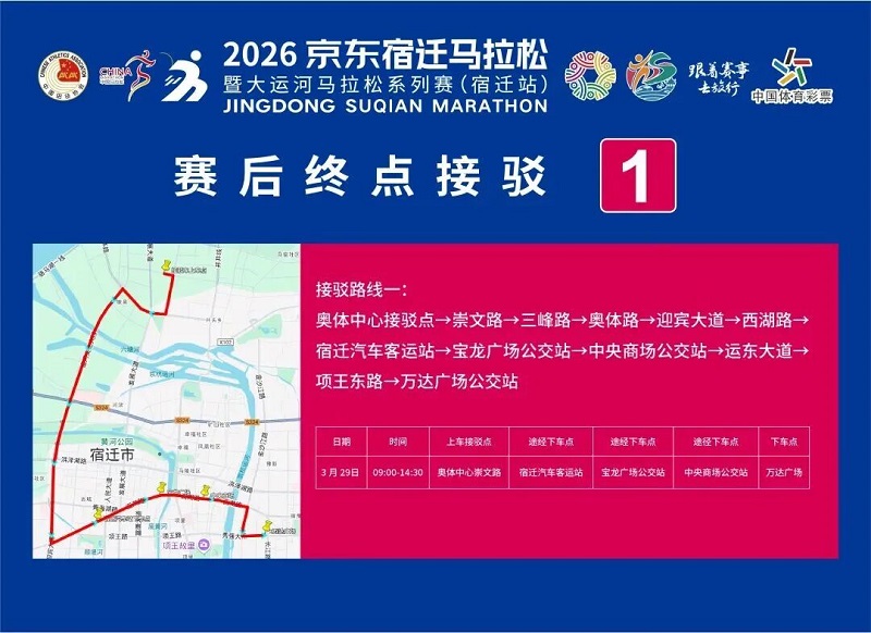 3月26日-30日,參賽選手可憑號碼布或中簽短信,免費乘坐宿遷市區(qū)內(nèi)(宿城區(qū)、宿豫區(qū)、洋河新區(qū)、湖濱新區(qū))公交車。