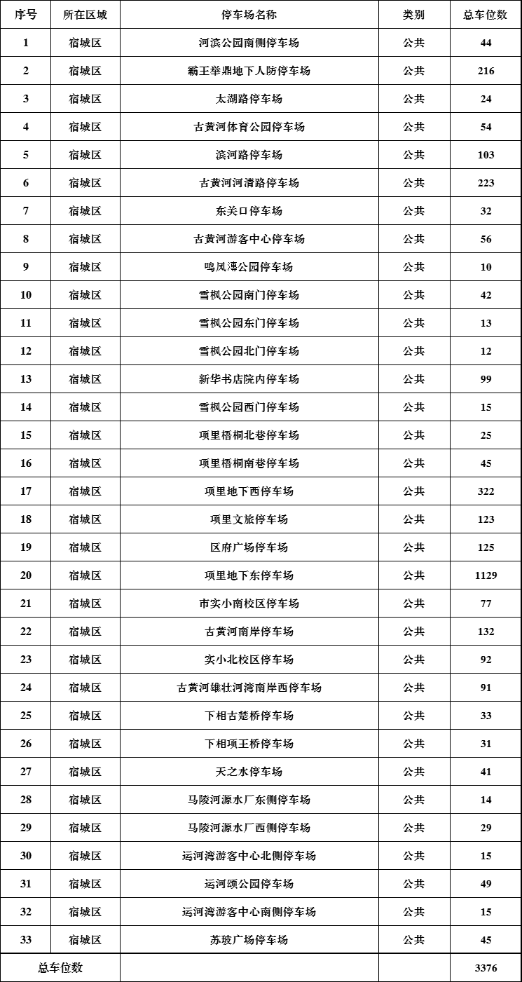 免費開放的停車區(qū)域為宿遷公共停車場建設管理有限公司管轄的收費公共停車場33個,停車泊位3376個;收費道路41條,停車泊位4821個,停車泊位總計8197個(具體位置見下方信息表)。