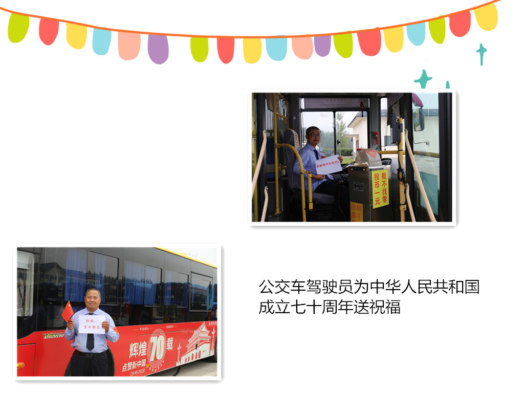 公交公司還在301路“西楚清風(fēng)號(hào)”及201路“紅旗車隊(duì)”公交車內(nèi)懸掛國(guó)旗,組織各崗位員工為中華人民共和國(guó)成立70周年送上祝福,表達(dá)對(duì)黨、對(duì)國(guó)家的熱愛。