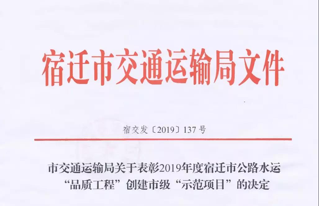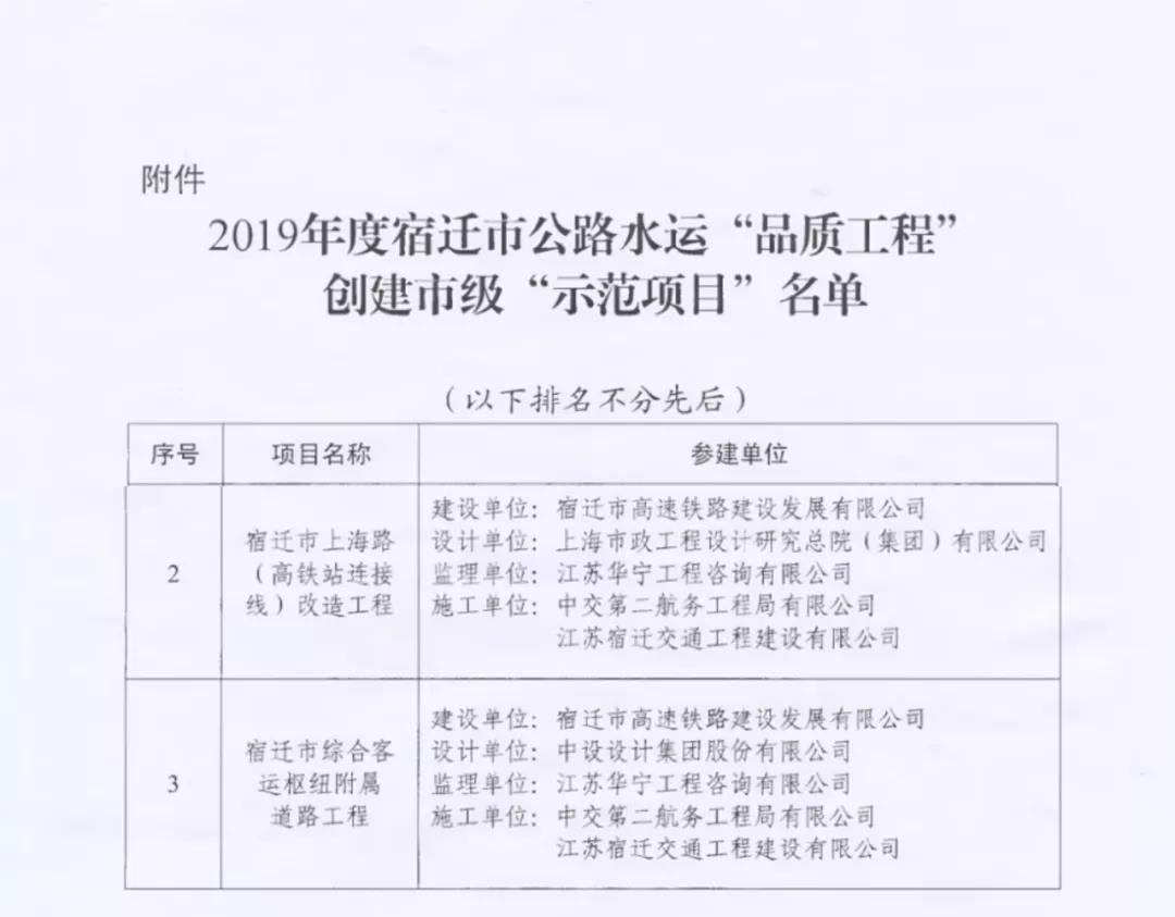 10月16日,宿遷市交通運輸局下發(fā)關于表彰2019年度宿遷市公路水運 “ 品質工程” 創(chuàng)建市級“ 示范項目”的決定,宿遷市高速鐵路建設發(fā)展有限公司(簡稱高鐵公司)承建的市上海路(高鐵站連接線)改造工程和綜合客運樞紐附屬道路工程“入選”。