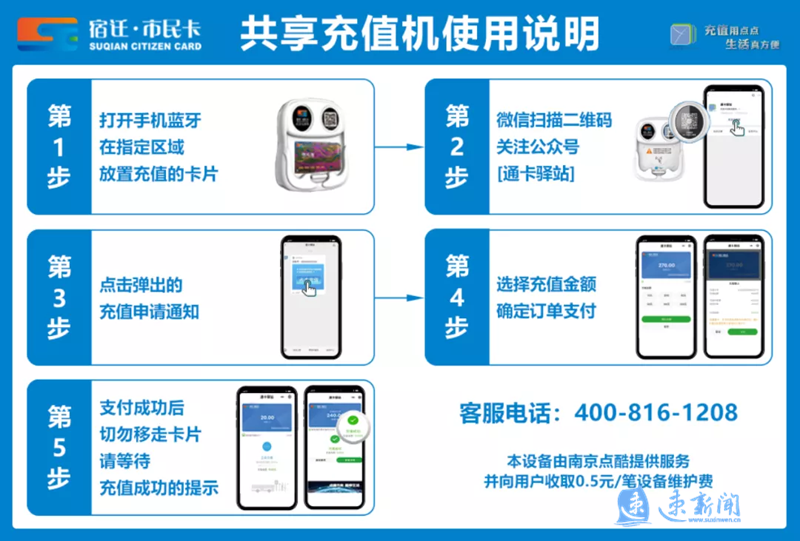 7月9日,記者從宿遷市民卡公司了解到,為提倡綠色出行,方便市民乘坐公交,進(jìn)一步落實交通部及省廳有關(guān)“一卡通全國通用和便攜應(yīng)用”的工作要求,解決全國一卡通實體卡線下充值繁瑣等問題,宿遷市民卡公司聯(lián)合公交公司、南京點(diǎn)酷公司共同推出宿遷市民卡共享充值機(jī)項目,本地持卡市民可在公交站點(diǎn)通過掃描設(shè)備二維碼對實體卡片進(jìn)行余額查詢、自助充值等服務(wù),免去用戶到網(wǎng)點(diǎn)充值的麻煩,為廣大市民出行提供方便。