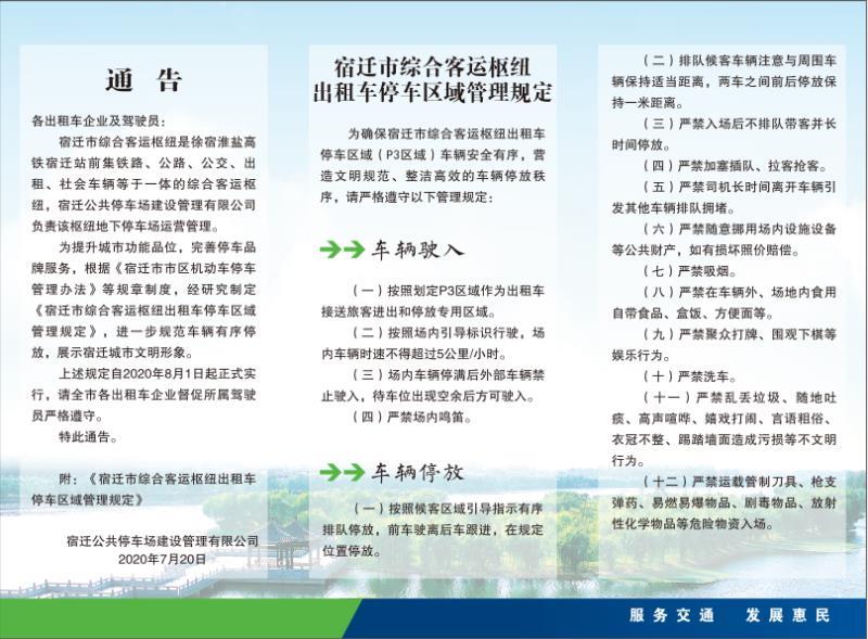 宿遷市綜合客運(yùn)樞紐正式啟用以來,為市民出行提供了極大便利。隨著高鐵線路班次的不斷優(yōu)化,乘車人數(shù)不斷增多,出租車用車需求攀升,對(duì)優(yōu)化該樞紐地下停車場(chǎng)停車管理水平提出了更高要求。為著力提升文明形象,結(jié)合場(chǎng)內(nèi)出租車停車區(qū)域(P3區(qū)域)運(yùn)營(yíng)管理實(shí)際情況,根據(jù)《宿遷市市區(qū)機(jī)動(dòng)車停車管理辦法》等規(guī)章制度,宿遷停車場(chǎng)公司升級(jí)“宿遷好停車”品牌運(yùn)營(yíng)管理服務(wù),研究制定《宿遷市綜合客運(yùn)樞紐出租車停車區(qū)域管理規(guī)定》(以下簡(jiǎn)稱《規(guī)定》),并于2020年8月1日起正式施行。
