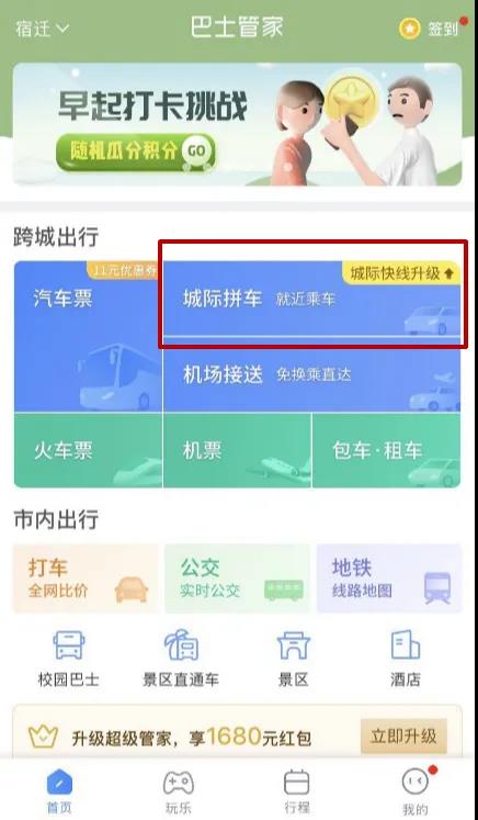 步驟一:打開(kāi)“巴士管家”APP或“巴士管家”微信小程序,選擇“城際拼車(chē);