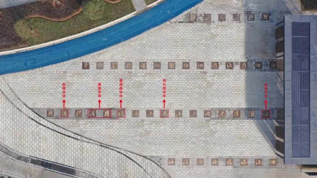 玖酒飄香浮雕整體采用99個(gè)“酒”字為設(shè)計(jì)元素,以純銅打造的“酒”字鑲嵌在深色的帶狀石材中,一條條深色的石帶如同宿遷千年運(yùn)河之水,承載著繁盛的宿遷釀酒業(yè)。用最具代表的篆書、隸書、魏碑、行書、草書等字體撰寫,并嵌入地下,呈現(xiàn)出宿遷酒都“得天地靈氣之無窮,承千年歷史之芬芳”的獨(dú)特內(nèi)涵。