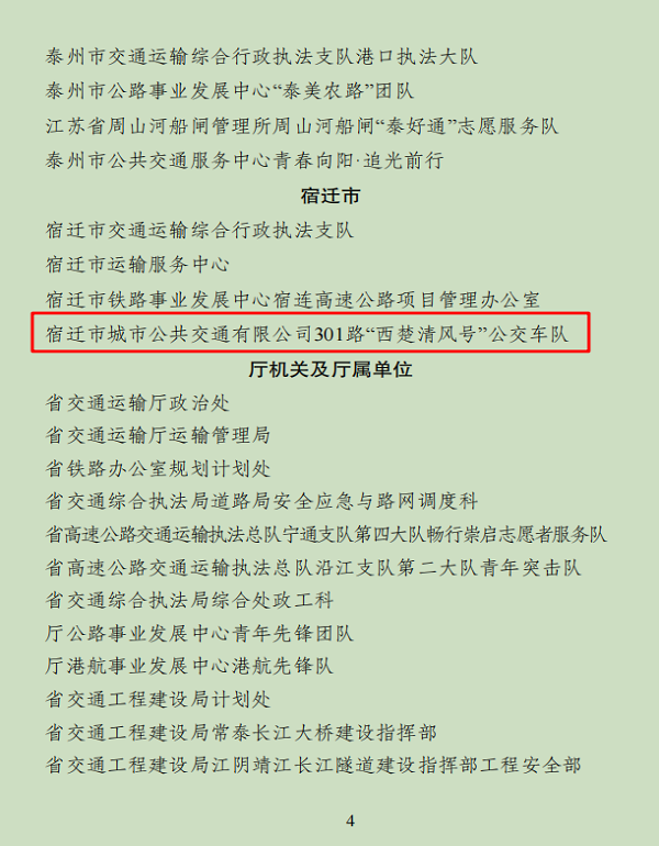近日,省交通運(yùn)輸行業(yè)黨委發(fā)布《關(guān)于表?yè)P(yáng)全省交通運(yùn)輸行業(yè)青年建功標(biāo)兵團(tuán)隊(duì)和青年建功標(biāo)兵個(gè)人的通報(bào)》,公交公司301路“西楚清風(fēng)號(hào)”公交車(chē)隊(duì)榮獲“全省交通運(yùn)輸行業(yè)青年建功標(biāo)兵團(tuán)隊(duì)”稱號(hào)。