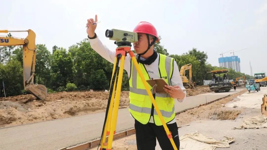 在迎賓大道二期快速化改造工程施工現(xiàn)場(chǎng),機(jī)械轟鳴,施工人員在高溫下?lián)]灑汗水,緊鑼密鼓地進(jìn)行水穩(wěn)攤鋪。施工場(chǎng)地沒有一絲陰涼,豆大的汗珠順著曬紅的臉頰淌了下來,但技術(shù)人員依然巋然不動(dòng),他深知測(cè)量工作差之毫厘,謬以千里。