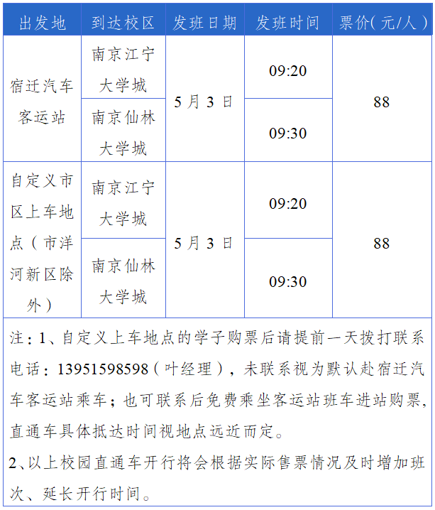 2.購票后可自行前往宿遷汽車客運站,想要自定義市區(qū)范圍內(nèi)乘車地點(市洋河新區(qū)不在范圍內(nèi))的同學(xué),網(wǎng)上購票后請?zhí)崆耙惶鞊艽?3951598598聯(lián)系自定義乘坐地點,車輛免費上門接送;如未購票也可提前聯(lián)系,客運站派車接至站內(nèi)購票后乘車直達校園。