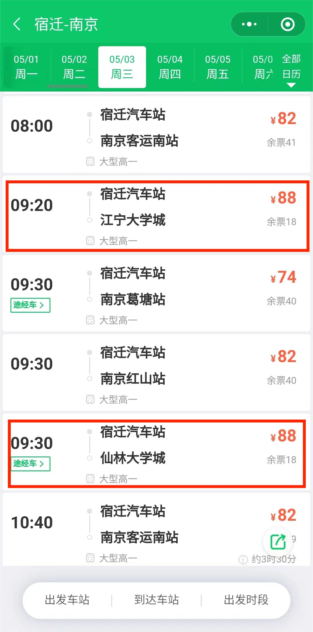 不必擔(dān)心!為方便宿遷學(xué)子假期返校,5月3日,宿遷汽車客運站推出直達南京仙林大學(xué)城、江寧大學(xué)城兩條班線,同學(xué)們可以直接享受從家到大學(xué)城的一站式體驗,也可以選擇赴客運站乘坐,免去中途換乘煩惱,實現(xiàn)家到學(xué)校的“一車直達”!