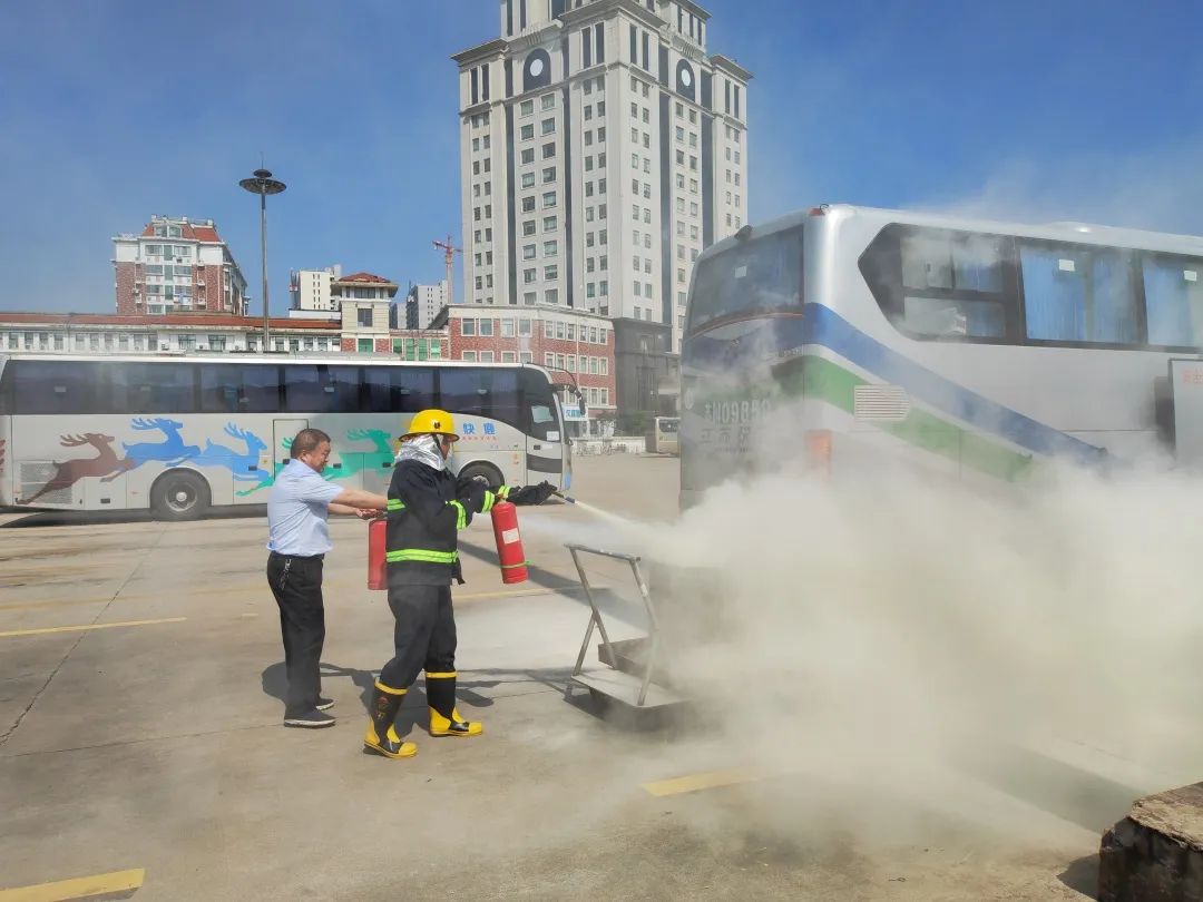 演練過程中,以客車突發(fā)“火災”為背景案例,隨著濃煙升起,駕駛員迅速停車打開車門,快速有序疏散車上旅客至安全地帶,然后關掉電源取下隨車滅火器,對準著火部位正面根部噴射,撲滅火災,并迅速立即撥打119消防部門報警,真正做到即停車、人撤離、速報警的演練目標要求,達到了預期效果。