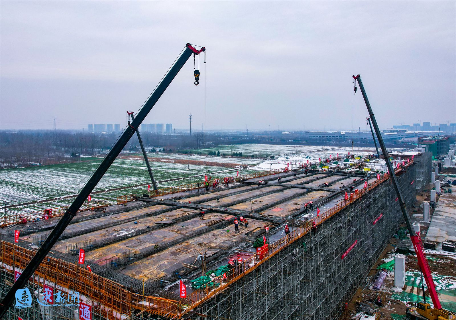 2月28日,在宿遷市酒都路(原張家港大道一期)快速化改造工程現(xiàn)場,施工器械不斷運(yùn)轉(zhuǎn),工人正在緊張施工。