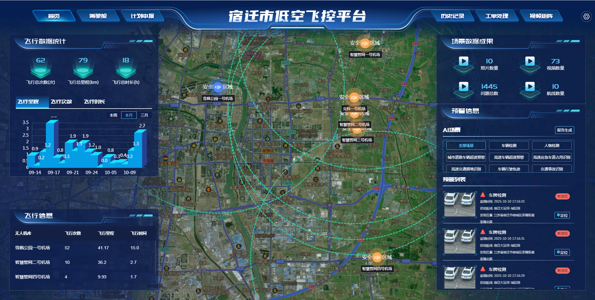 在宿遷市低空飛行服務(wù)中心,一組組高效率數(shù)據(jù)智能化場景應(yīng)用刷新大眾眼球:依托無人機(jī)AI平臺,自動識別道路施工中隱患行為,同時自動標(biāo)記隱患位置、推送預(yù)警信息并督促相關(guān)方整改,形成全鏈條的管理閉環(huán);通過無人機(jī)移動的攝像頭,能夠?qū)崟r監(jiān)控學(xué)校周邊交通狀況,并通過喊話功能引導(dǎo)車輛有序通行……