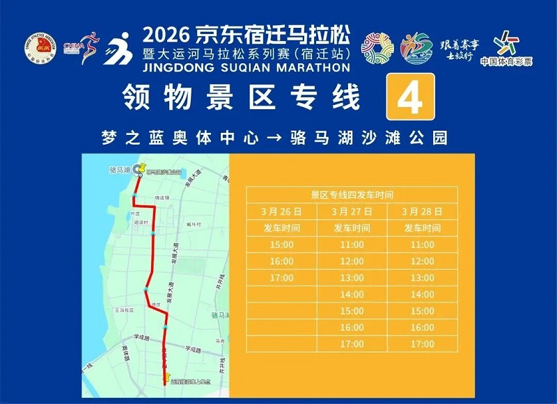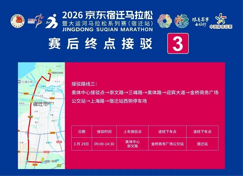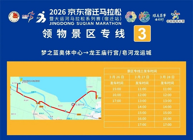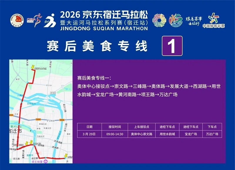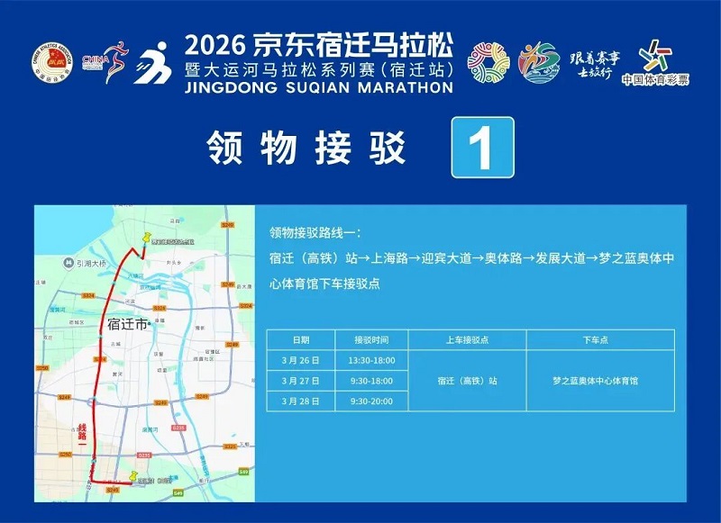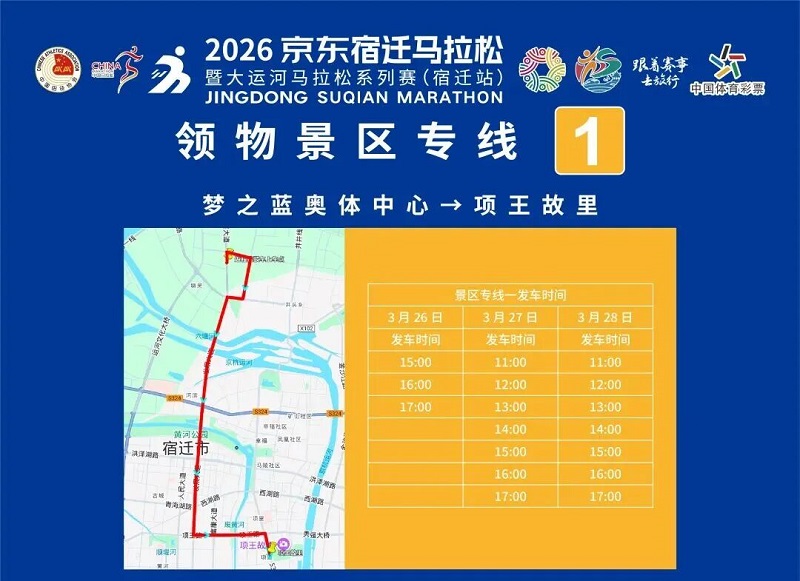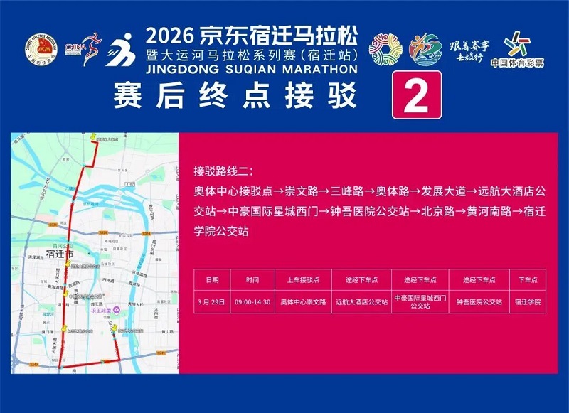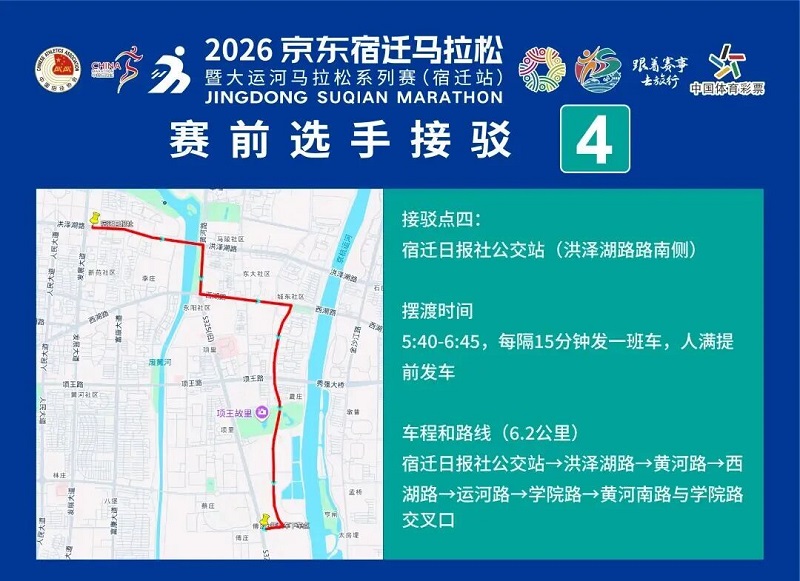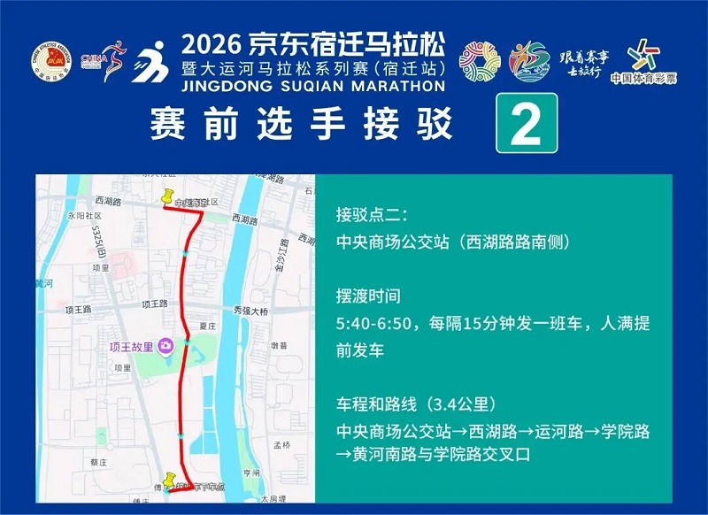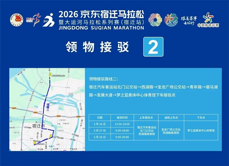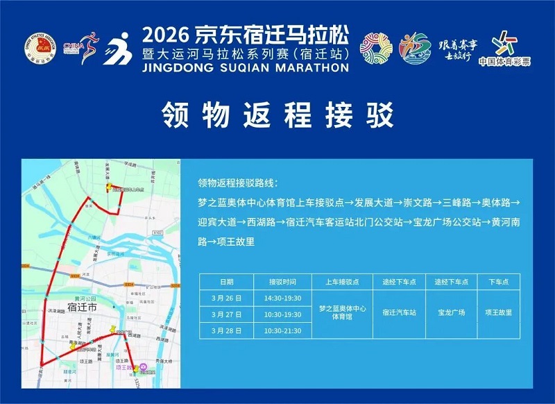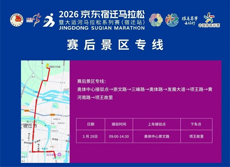 3月26日-30日,參賽選手可憑號碼布或中簽短信,免費(fèi)乘坐宿遷市區(qū)內(nèi)(宿城區(qū)、宿豫區(qū)、洋河新區(qū)、湖濱新區(qū))公交車。