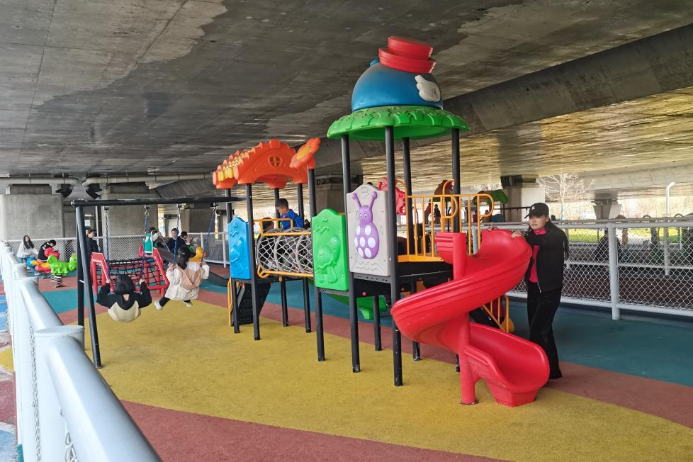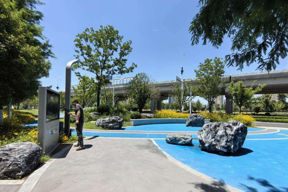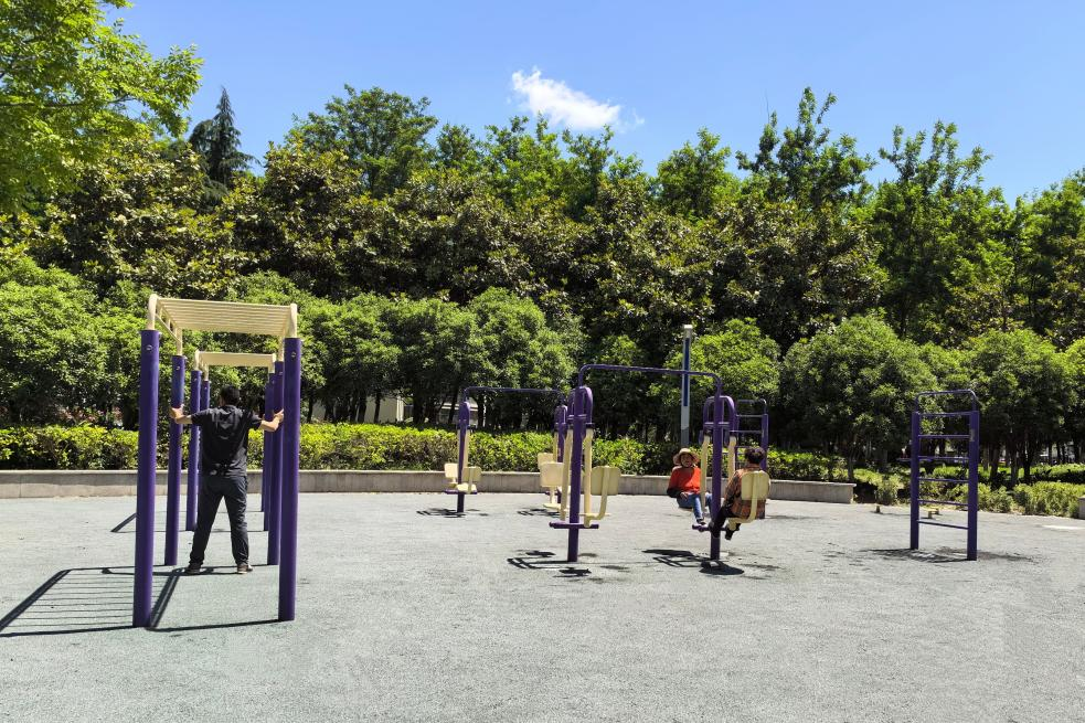 迎賓大道綠道全長8公里,通過串聯(lián)小區(qū)、街角廣場、綠地公園、橋下空間等地塊,實現(xiàn)慢行系統(tǒng)與線性空間的有效整合。綠道在串聯(lián)道路兩側(cè)原有綠地空間的基礎(chǔ)上,合理增加了小游園、主題公園、活動廣場、智慧健身等功能性場地,如新建各類休閑健身場地8處、樂享驛站6座、智慧健身步道1.5公里,新增休閑座椅、景觀燈、健身器材、兒童游樂設(shè)施、垃圾桶、無障礙設(shè)施等配套便民設(shè)施,沿線增加微山花園、繡球花園、碉堡花園等多個游園節(jié)點,打造滿足全齡活動的“樂享游園”。